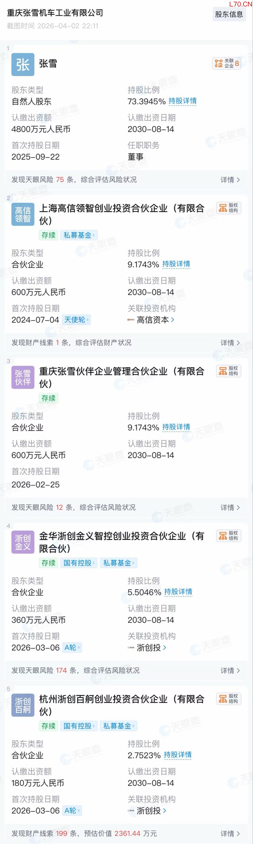 成立于2024年4月2日的重庆张雪机车工业有限公司(以下简称“张雪机车”)共拿到两笔投资。2024年7月高信资本名下基金上海高信领智创业投资合伙企业(有限合伙)投资了2000万元,持股约9.17%。2026年1月,浙江省国有资本运营有限公司旗下浙江省创业投资集团有限公司(以下简称“浙创投”)通过两只基金(杭州浙创百舸、金华浙创金义智控)完成对张雪机车的A轮投资,投资总额9000万元,估值一举推至10.9亿元。