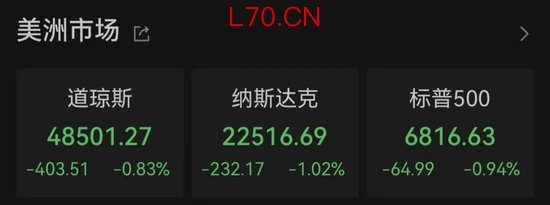 截至当天收盘,道琼斯工业平均指数比前一交易日下跌403.51点,收于48501.27点,跌幅为0.83%;标准普尔500指数下跌64.99点,收于6816.63点,跌幅为0.94%;纳斯达克综合指数下跌232.17点,收于22516.69点,跌幅为1.02%。