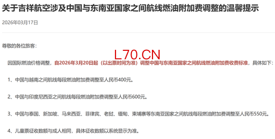 元股证券:ygzq.hk3月17日,吉祥航空公告称,因国际燃油价格调整,自2026年3月20日(出票时间)起将调整中国与东南亚国家间航线的燃油附加费。其中,中国-越南航线每段燃油附加费调整至400元,中国-印度尼西亚航线调整至600元,中国与泰国、新加坡、马来西亚、菲律宾、老挝、缅甸、柬埔寨等航线调整至550元。