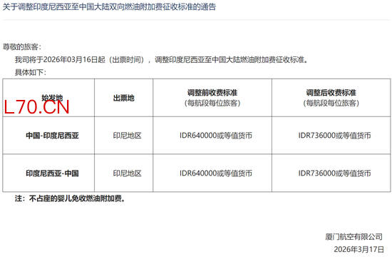 同日,厦门航空公告称,自3月16日起将上调印尼-中国航线燃油附加费,由此前的640,000印尼盾上调至736,000印尼盾,按当前汇率约合人民币290元升至330元,上涨约15%。