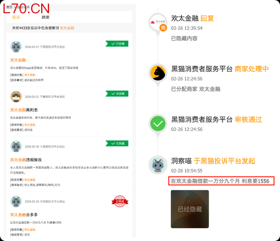 除了涉嫌滥用信息授权和违规引流,欢太金融还频繁因“联手合作平台发放超高利率贷款”受到消费者投诉。